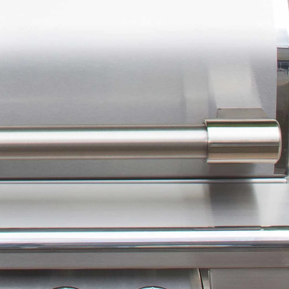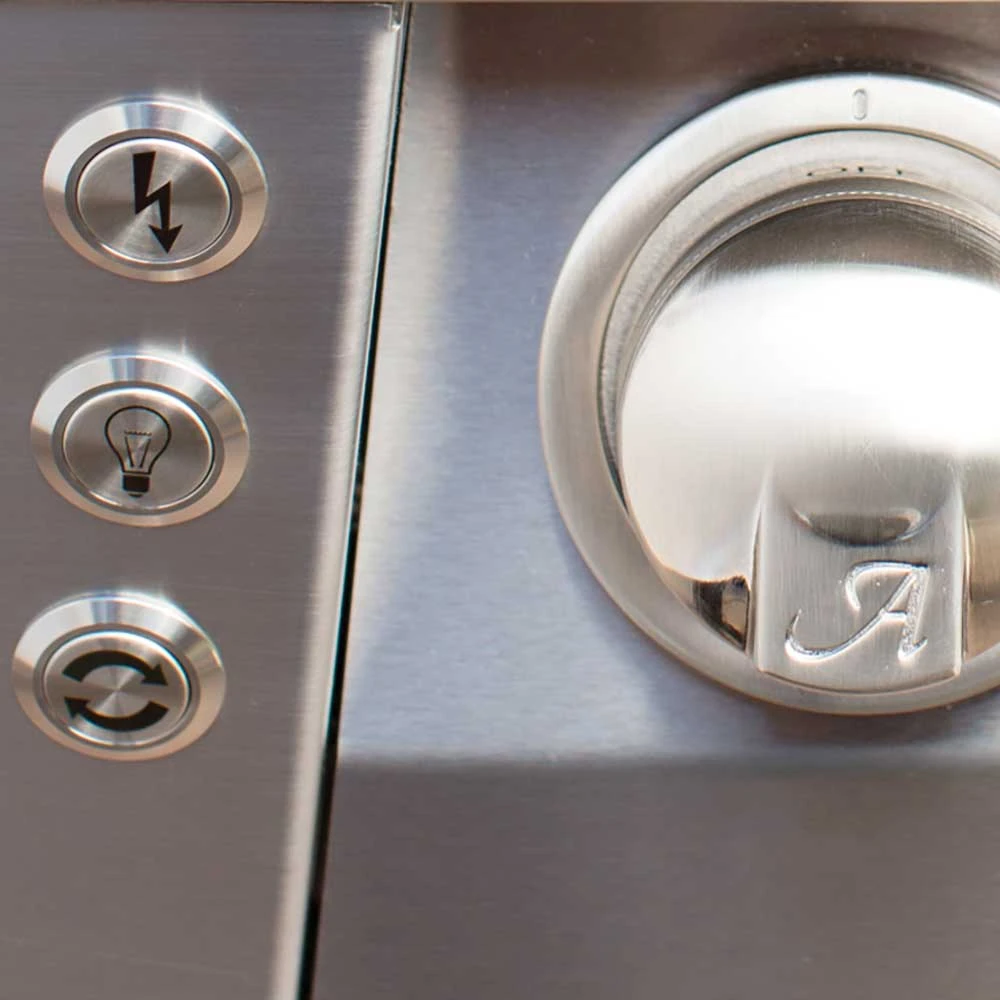 Alfresco Grills brings restaurant-inspired luxury and professional grilling results to your outdoor kitchen with the all-new ALXE series grill. The Alfresco ALXE-56BFGC-LP 56-inch freestanding gas grill has three(3) high-temperature, titanium and stainless steel blend burners and one ceramic sear zone burner that produce 27,500 BTUs each, for a total of 110,000 BTUs of total cooking power on the grilling surface. The high-tech Sear Zone burner reaches 1500 degrees F in four minutes, and cooks 50 percect faster with virtually no flare-ups. The special V-shaped flavorizer cooking grate also captures the natural juices, fats, and flavors, then caramelizes them to the food for delectable, mouthwatering flavor. The hidden/integrated rotisserie system has two(2) 15,000 BTU rear ceramic infrared burners and a whisper-silent motor with a chain-driven spit that has 120 pounds of turning torque. The rotisserie spit rod can be conveniently stored under the bullnose of the drip tray when not in use. Grill also features a 5,000 BTU smoker system with a stainless steel burner that ejects smoke at 200 degrees onto your grill and a smoker drawer that is large enough to hold peppers, herbs, and wood chunks and is sealed to hold liquids as well. Unique pyramid-shaped ceramic briquettes eliminate hot spots and maximize flavor as they evenly deliver heat to the cooking surface. An air-cooled front control panel keeps your knobs and control panel cool while grilling, protecting both the equipment and your hands from high heat. The 600-degree heat-resistant silicone sleeves protect the electrical wires of the grill. This propane gas grill has a spacious 998 square inches of actual grilling area, a double-lined hood for durability, a removable 3-position warming rack, heavy-duty rolled stainless steel cooking grids capable of providing perfect steakhouse results and a 56-inch stainless steel grill cart with foldable & removable side shelves, two pull-out drawers and two access doors. ALXE model grills also feature rich amber/yellow LED front panel lights, stainless steel push-button ignition, lighting and rotisserie controls, a new torsion spring-assisted hood system, and nickel-plated, ergonomically-designed knobs and bezels. This Alfresco, all-American Made gas grill includes a premium grill cover with the purchase of the unit.