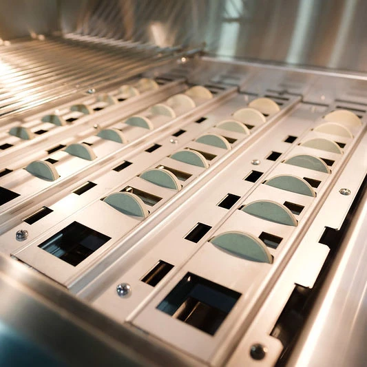 Aspire by Hestan built-in grills deliver exceptional power, masterful performance and heavy-duty resilience into standard enclosures or Aspire grill carts. Each unit is built in California from heavy-duty American steel. Incomparable features include spring-assisted hood, dual halogen lighting and flip-to-clean ceramic briquettes. This 36-inch gas grill has two (2) heavy-duty 304 stainless steel tubular burners that deliver 23,000 BTUs each of consistent heat and years of reliability, and one (1) high-performance variable ceramic infrared sear burner that delivers an additional 23,000 BTUs of searing heat to lock in flavor. Built-in ceramic infrared rotisserie burner delivers searing heat from 12,000 to 18,000 BTUs and is located above the stainless steel rotisserie to lock in flavor and juices. Includes an external rotisserie motor with a single-speed, 3 rpm, 40 in-lbs motor and porcelain broiling pan with stainless steel rotisserie spit and forks. The patent-pending symmetrical flip-to-clean radiant tray generates sizzling flavor with ceramic disc briquettes across the 647-square-inch primary grilling surface, and the 183-square-inch warming rack surface makes room for large cookouts. This grill features a 304 stainless steel heavy-gauge, welded body construction with spring-assisted hood, and the patented Marquise Accented control panel with LED lighting and hood handle with commercial-grade end caps provide industry-exclusive durability and style. The hot surface ignition system provides consistent start-up and has a stainless steel removable drip tray for easy maintenance and cleanup. Proudly made in the USA, Aspire by Hestan backs their products with a lifetime warranty on welded body, stainless tubular burners and variable sear burners.