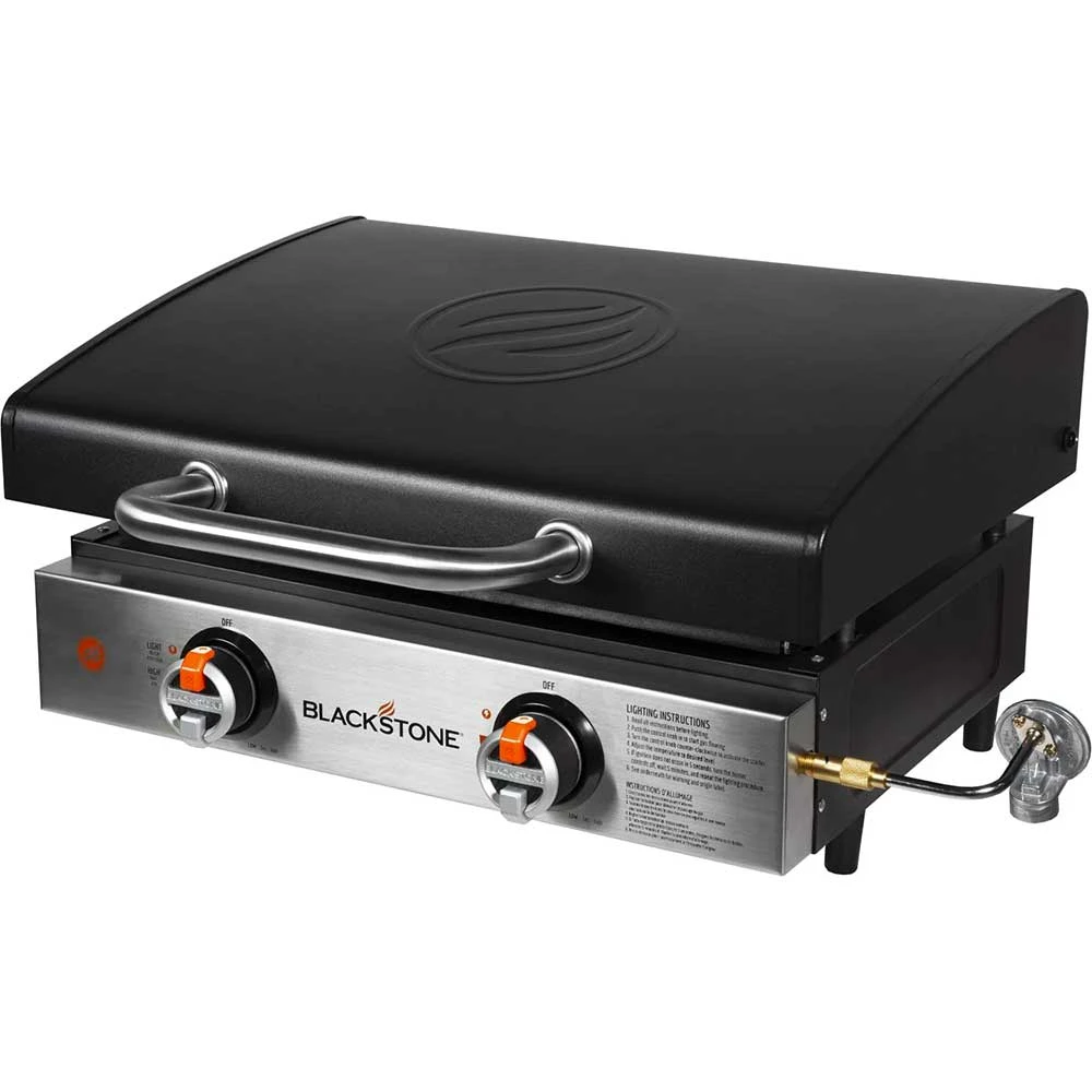 Bring the Blackstone cooking experience on your next trip with the 22-inch tabletop griddle. This portable griddle offers 362 square inches of all-purpose cooking space so you can cook for the whole party. Two powerful stainless steel H-burners deliver 24,000 BTUs of cooking power across the heavy-duty surface, ensuring even and consistent heat for all kinds of meals. You can even create two distinct temperature zones for cooking a variety of foods at once. The steel griddle plate stands up to the toughest jobs and guarantees years of use out in the elements. Blackstone has implemented their own patented rear grease management system to provide no-mess, hassle-free operation, and easy cleanup. Upgraded, easy-to-use control knobs on the front stainless steel control panel let you easily control temperature and get you grilling fast with simple piezo ignition. Protect your griddle from dirt, damage, and the weather with the included hood. This hood secures to the rear of the griddle and lifts out of the way easily when cooking. The griddle comes ready for use with 1 lb propane canisters, but can be upgraded to use 20 lb tanks with an optional adapter hose & regulator (sold separately). This portable, propane-powered griddle will make you the hero of your next camping trip or tailgate.