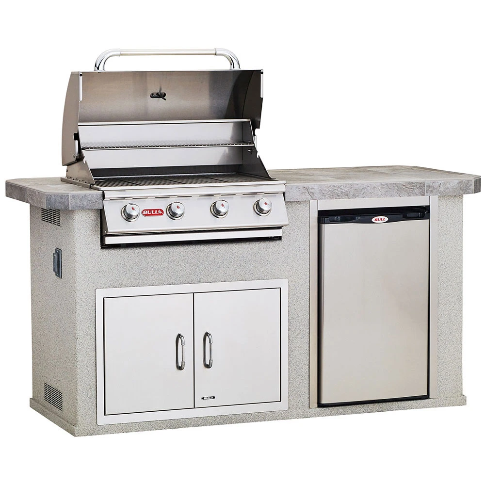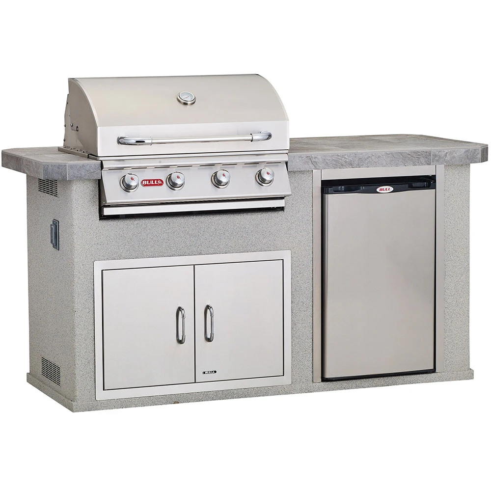 The Power-Q outdoor kitchen island from Bull BBQ is a wonderful addition to any smaller backyard or patio for the ultimate grill master. It features a stainless steel Outlaw 4-burner gas grill, 30-inch double access door and refrigerator and provides ample counter space is great for preparing your favorite recipes. Having an outdoor kitchen or BBQ island pre-manufactured may ease the process of creating an outdoor area to enjoy with family or friends. One of these models will eliminate the need to scour your local area for a variety of construction specialists, deal with on-site construction messes or suffer potential stresses from failed production times. These handmade BBQ islands arrive completely finished, ready to be installed in the location of your choosing. The Bull BBQ Power-Q BBQ Island (Power-Q) includes the 30-inch 4-burner Outlaw gas grill, 30-inch double access door, non-outdoor rated refigerator and two(2) stainless steel vents. The BBQ is a small-sized outdoor kitchen perfect for serving drinks and is a wonderful addition to any smaller backyard or patio area. The overall construction of all Bull BBQ islands features rust-resistant galvanized steel studs 16 inches on center, metal on the interior flooring, and outdoor rated non-flammable cement board. The base features a solid finished stucco base bottom with Trex base protection strips with galvanized tracking. Countertop features 16-inch x 16-inch porcelain tile and galvanized welded tube steel framing. The Power-Q BBQ Island comes standard in stucco base and 16-inch by 16-inch porcelain tile. All Bull BBQ islands take 4-8 weeks to deliver, after the date of purchase. Item is non-refundable once the order is in fabrication.