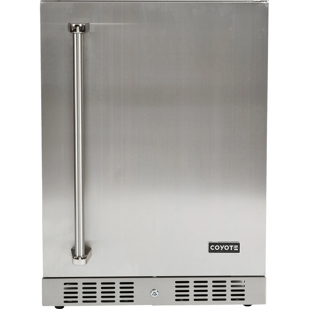 Create the outdoor kitchen of your dreams using Coyote BBQ island accessories made to last and give remarkable performance. The C1BIR24-R features a stainless steel exterior, adjustable leveling legs, and a hidden hinge right swing door. This unit offers 5. 5 cubic feet of storage capacity with four adjustable wire shelves for more convenient storage of drinks and condiments. The durable design and UL rating make this refrigerator ideal for outdoor use. The digital temperature controls and display allow you to precisely adjust and monitor the internal temperature. It also offers front venting, which allows for a professional-style, built-in installation in your outdoor kitchen. This 24-inch compact refrigerator also sports a stylish interior light, security lock and automatic defrost for easy cleaning.