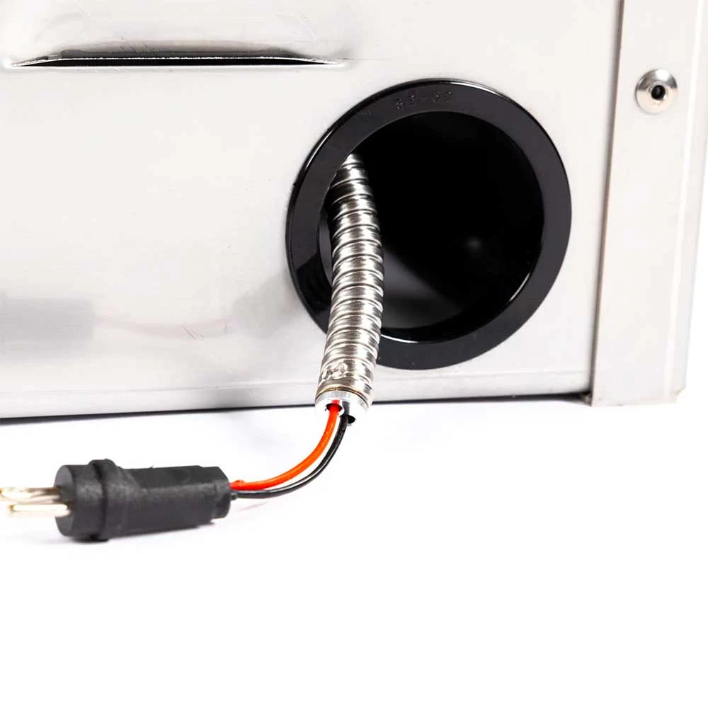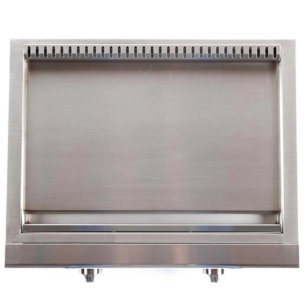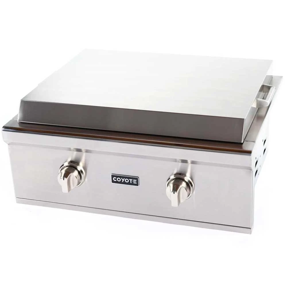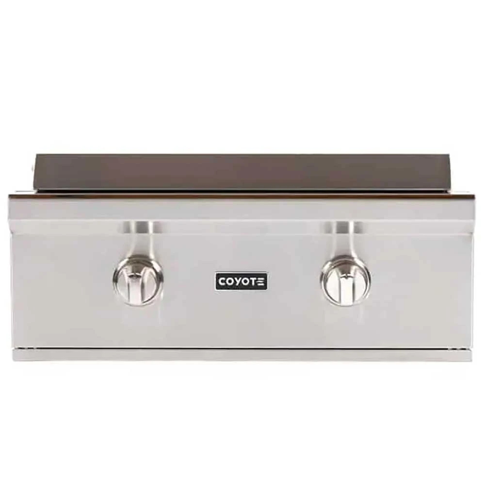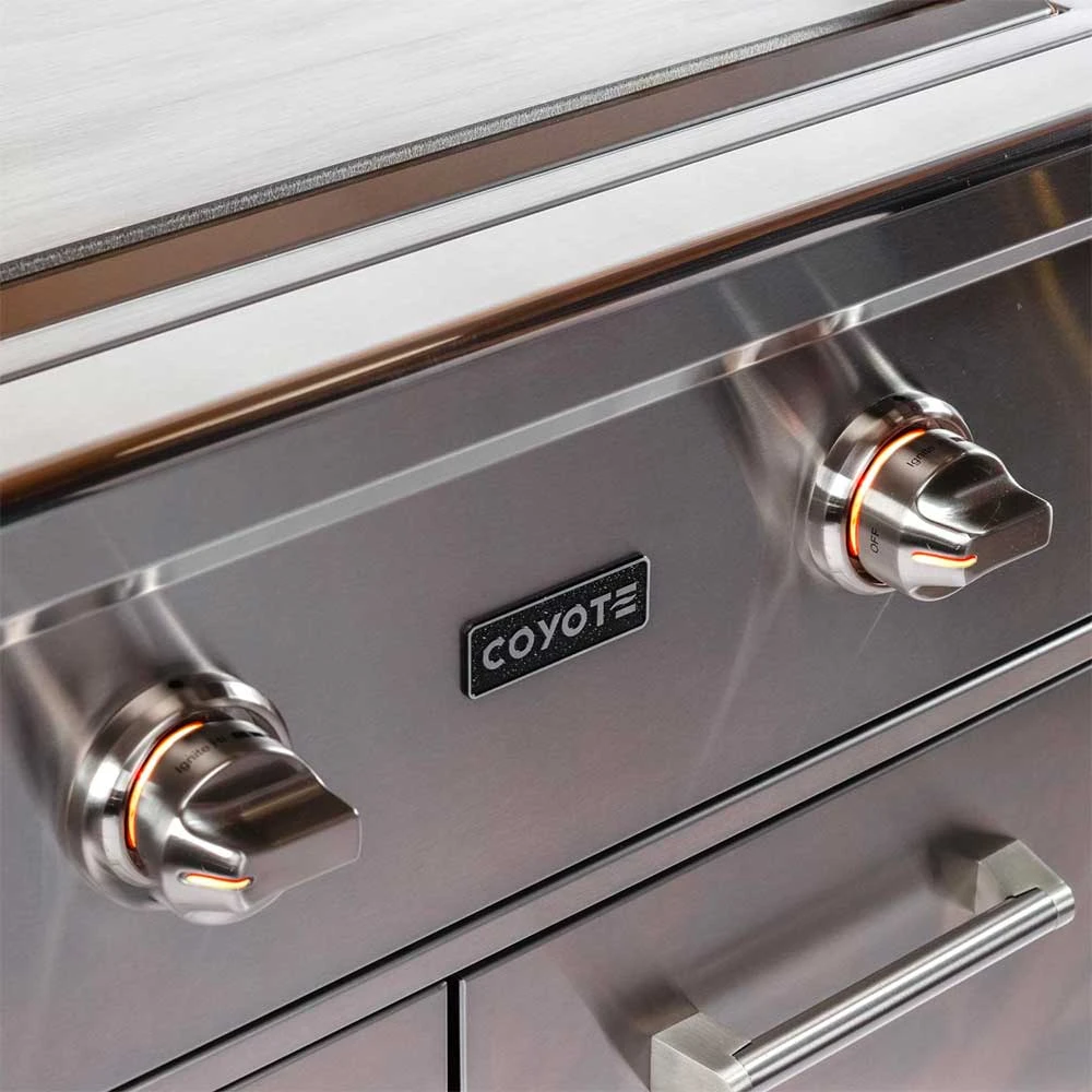 Merging durable construction, design, and value, the Coyote flat top gas grill will make a statement in any outdoor kitchen. This 30-Inch built-in flat top gas grill features two u-shaped stainless steel burners rated for up to 36,000 BTUs. A heavy gauge stainless steel cooking surface ensures even heating. Cleanup is also simple with a removable grease tray. This propane gas griddle is made entirely of 304-grade stainless steel for long-lasting durability in outdoor environments. The 400 square inch cooking surface is covered by two independent heat zones, allowing you to cook simultaneously at different temperatures. Constructed with safety in mind, LED lights in the knob bezels will glow orange when the burner is lit. If the light turns blue while in use, this indicates there is no longer a flame present. Includes a stainless steel cover and requires a 120V connection.