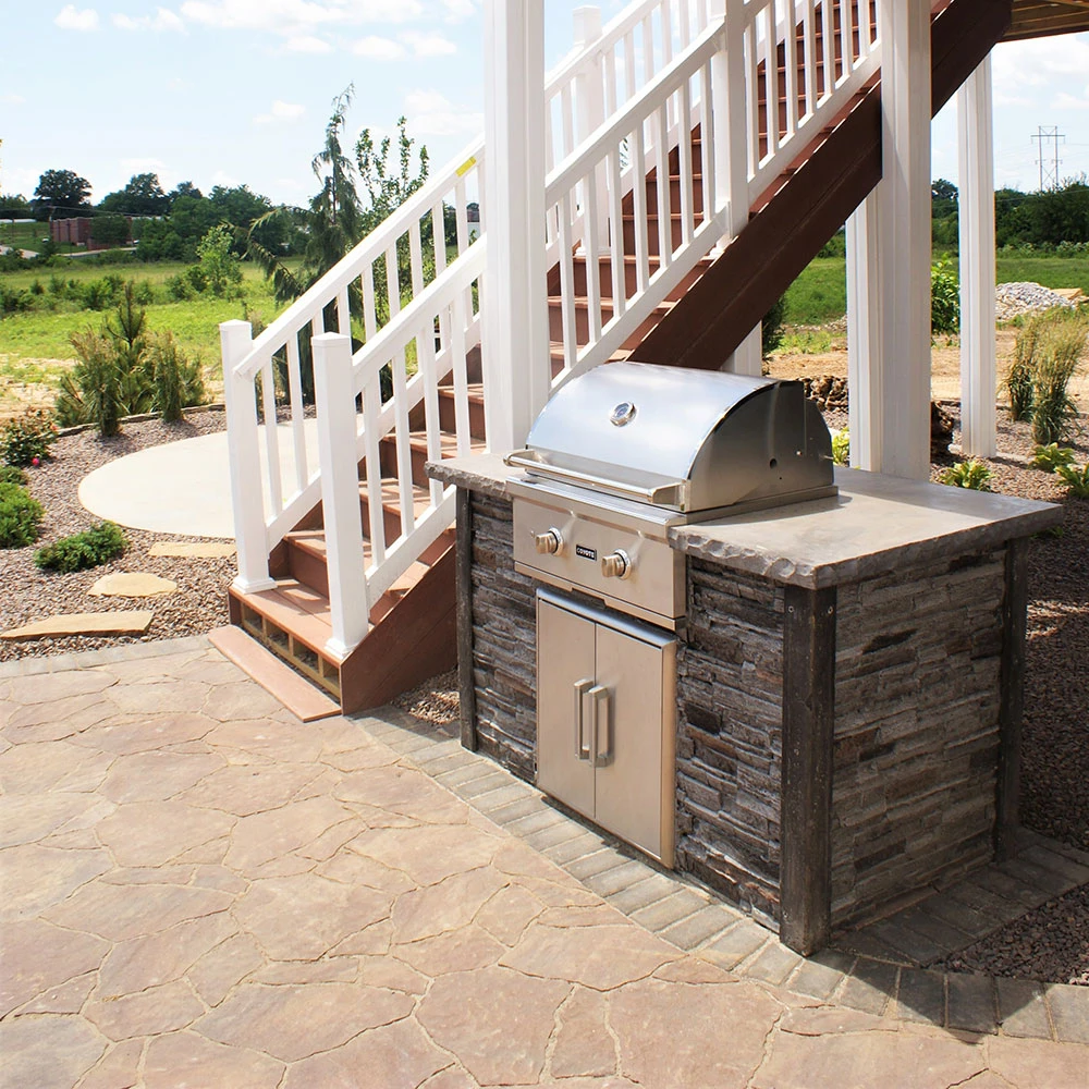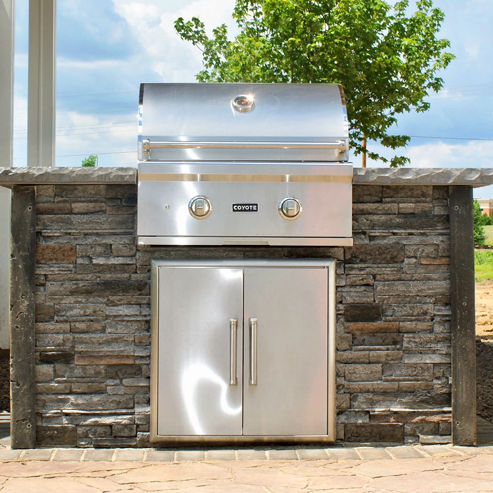 Coyote has partnered with RTA Outdoor Living and created one goal, to set out and remove the challenges associated with selecting, designing, and building an outdoor kitchen. RTA Outdoor Living has accomplished this by creating a unique building method that allows you to create an easy and affordable higher-quality alternative to conventional outdoor living construction. RTA Outdoor Living outdoor kitchen has simplified the construction process by using structural high-strength concrete panels (precast with a stone, wood or concrete face) that can be assembled in a few hours, with the help of a couple of people. In comparison, scratch-built and ready-to-finish (RTF) outdoor kitchens require multiple materials, steps, and trades to complete. RTA panels are self-supporting and aesthetic with no finish or masonry work required. Panels are simply set in place, attached with L-brackets and self-tapping screws, corners are mounted, countertop (included) and appliances are installed, and your outdoor kitchen is complete. RTA Outdoor Living BBQ islands are constructed of superior material technology. RTA Outdoor Living BBQ Island panels are approximately 3/4″ – 1 1/4″ thick and manufactured from a patented high-strength concrete composite with micro-fiber technology. Panels are engineered for outdoor environments, UV stable, virtually impervious to freeze/thaw cycles, and able to withstand all climates. The RTA Outdoor Living (RTAC-G5-SG) ready-to-assemble 5-foot outdoor kitchen island fits Coyote’s C-Series 28-Inch 2-Burner Built-In Natural Gas Grill (Model# C1C28) and Coyote’s 26-inch Stainless Steel Double Access Door (Model# CDA2426). Stone gray stacked stone proprietary concrete island frame with distressed gray 1 1/4-inch thick chiseled-edge concrete countertop. Products shown must be purchased separately, the price listed is ONLY for the BBQ Island, no components are included.