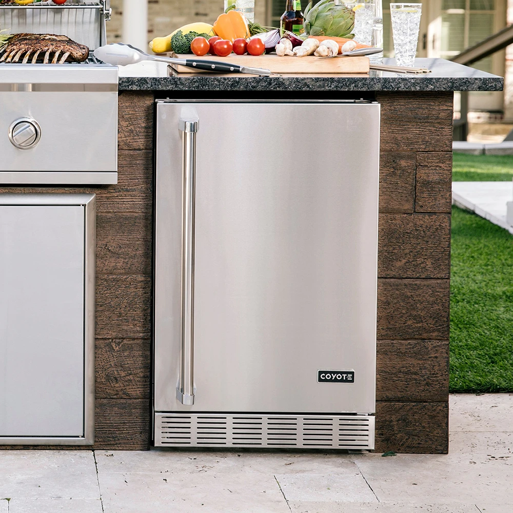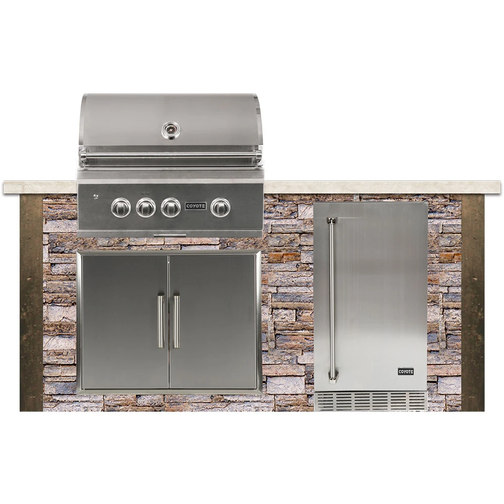 Coyote has partnered with RTA Outdoor Living and created one goal, to set out and remove the challenges associated with selecting, designing, and building an outdoor kitchen. RTA Outdoor Living has accomplished this by creating a unique building method that allows you to create an easy and affordable higher-quality alternative to conventional outdoor living construction. RTA Outdoor Living outdoor kitchen has simplified the construction process by using structural high-strength concrete panels (precast with a stone, wood or concrete face) that can be assembled in a few hours, with the help of a couple of people. In comparison, scratch-built and ready-to-finish (RTF) outdoor kitchens require multiple materials, steps, and trades to complete. RTA panels are self-supporting and aesthetic with no finish or masonry work required. Panels are simply set in place, attached with L-brackets and self-tapping screws, corners are mounted, countertop (included) and appliances are installed, and your outdoor kitchen is complete. RTA Outdoor Living BBQ islands are constructed of superior material technology. RTA Outdoor Living BBQ Island panels are approximately 3/4″ – 1 1/4″ thick and manufactured from a patented high-strength concrete composite with micro-fiber technology. Panels are engineered for outdoor environments, UV stable, virtually impervious to freeze/thaw cycles, and able to withstand all climates. The RTA Outdoor Living (RTAC-G6-P-SB) ready-to-assemble 6-foot deluxe outdoor kitchen island fits Coyote’s S-Series 30-Inch 3-Burner Built-In Natural Gas Grill with RapidSear Infrared Burner and Rotisserie (Model# C2SL30), Coyote 21-Inch 4.1 Cu. Ft. Right Hinge Outdoor Rated Compact Refrigerator (Model# CBIR-R) and Coyote’s 31-inch Stainless Steel Double Access Door (Model# CDA2431). Brown terra stacked stone proprietary concrete island frame with distressed taupe 1 1/4-inch thick chiseled-edge concrete countertop. Products shown must be purchased separately, the price listed is ONLY for the BBQ Island, no components are included.