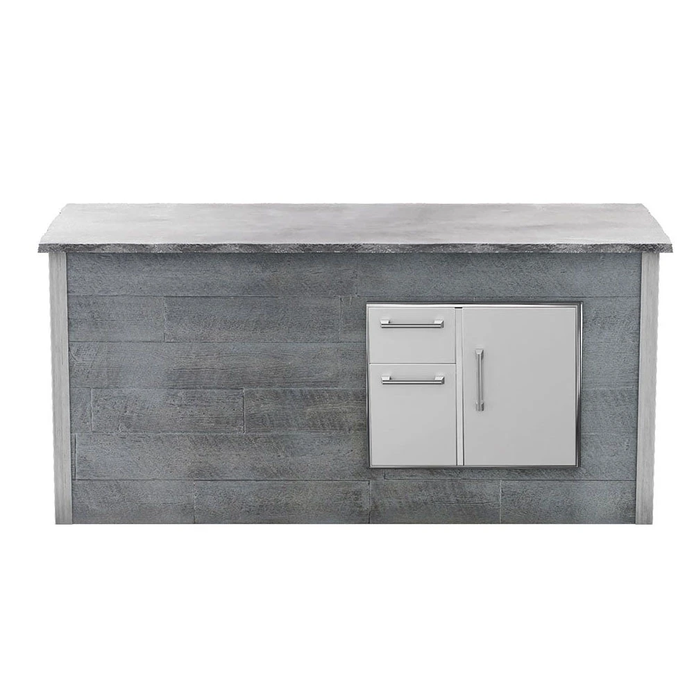 Coyote has partnered with RTA Outdoor Living and created one goal, to set out and remove the challenges associated with selecting, designing, and building an outdoor kitchen. RTA Outdoor Living has accomplished this by creating a unique building method that allows you to create an easy and affordable higher-quality alternative to conventional outdoor living construction. RTA Outdoor Living outdoor kitchen has simplified the construction process by using structural high-strength concrete panels (precast with a stone, wood or concrete face) that can be assembled in a few hours, with the help of a couple of people. In comparison, scratch-built and ready-to-finish (RTF) outdoor kitchens require multiple materials, steps, and trades to complete. RTA panels are self-supporting and aesthetic with no finish or masonry work required. Panels are simply set in place, attached with L-brackets and self-tapping screws, corners are mounted, countertop (included) and appliances are installed, and your outdoor kitchen is complete. RTA Outdoor Living BBQ islands are constructed of superior material technology. RTA Outdoor Living BBQ Island panels are approximately 3/4″ – 1 1/4″ thick and manufactured from a patented high-strength concrete composite with micro-fiber technology. Panels are engineered for outdoor environments, UV stable, virtually impervious to freeze/thaw cycles, and able to withstand all climates. The RTA Outdoor Living (RTAC-G8) ready-to-assemble 8-foot outdoor kitchen island fits Coyote’s 31-inch Door and Double Drawer Combination Storage (Model# CCD-2DC31). Stone gray weathered wood proprietary concrete island frame with distressed gray 1 1/4-inch thick chiseled-edge concrete countertop. Products shown must be purchased separately, the price listed is ONLY for the BBQ Island, no components are included.