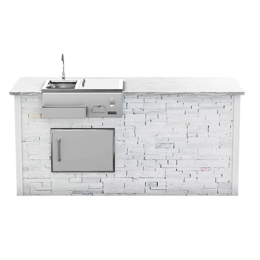 Coyote has partnered with RTA Outdoor Living and created one goal, to set out and remove the challenges associated with selecting, designing, and building an outdoor kitchen. RTA Outdoor Living has accomplished this by creating a unique building method that allows you to create an easy and affordable higher-quality alternative to conventional outdoor living construction. RTA Outdoor Living outdoor kitchen has simplified the construction process by using structural high-strength concrete panels (precast with a stone, wood or concrete face) that can be assembled in a few hours, with the help of a couple of people. In comparison, scratch-built and ready-to-finish (RTF) outdoor kitchens require multiple materials, steps, and trades to complete. RTA panels are self-supporting and aesthetic with no finish or masonry work required. Panels are simply set in place, attached with L-brackets and self-tapping screws, corners are mounted, countertop (included) and appliances are installed, and your outdoor kitchen is complete. RTA Outdoor Living BBQ islands are constructed of superior material technology. RTA Outdoor Living BBQ Island panels are approximately 3/4″ – 1 1/4″ thick and manufactured from a patented high-strength concrete composite with micro-fiber technology. Panels are engineered for outdoor environments, UV stable, virtually impervious to freeze/thaw cycles, and able to withstand all climates. The RTA Outdoor Living (RTAC-B8) ready-to-assemble 8-foot outdoor kitchen island fits Coyote’s 30-inch Refreshment Center (Model# CRC) and 17-inch 304 stainless steel Single Access Door (Model# CSA1724). Modern white stacked stone proprietary concrete island frame with a distressed white 1 1/4-inch thick chiseled-edge concrete countertop. Products shown must be purchased separately, the price listed is ONLY for the BBQ Island, no components are included.