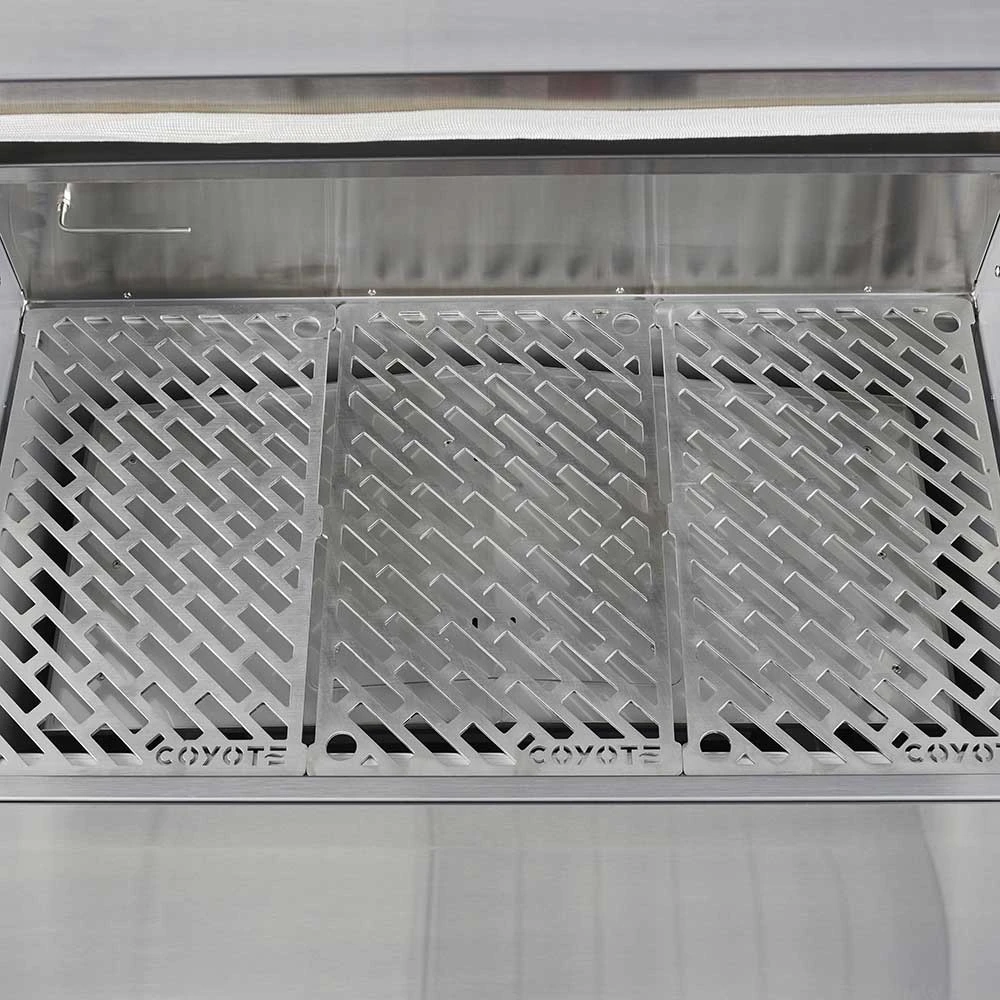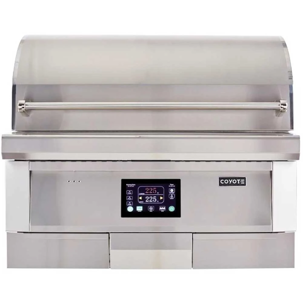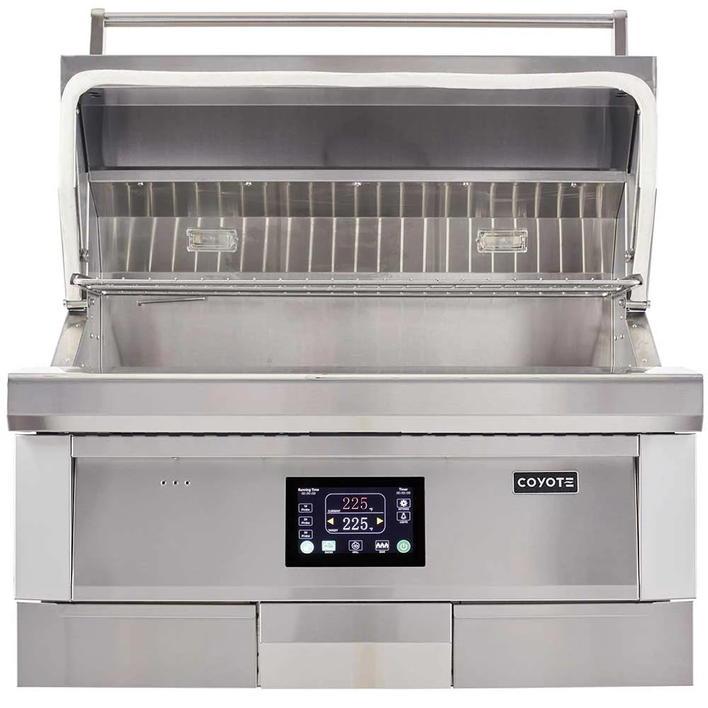 The Coyote 36-Inch Built-In Pellet Grill C1P36 heralds the next generation of outdoor cooking with the look, versatility, and superior functionality of a luxury indoor appliance. The state-of-the-art digital touch screen, three food temperature probes as well as a range of even heat settings, allows you to utilize this high-end outdoor grill in a similar fashion to an indoor oven. Coyote green, smart drop pellet system can be used with any flavored wood pellet to further enhance the outdoor entertaining experience. Design is in the details and this robust grill includes a spring-assisted hood that can be lifted with a touch of a finger. The Coyote C1P36 built-in pellet grill brings the functionality and luxury of an indoor appliance to your backyard. This 36-inch, built-in pellet grill features intuitive digital touch screen controls and features that help take the guesswork out of grilling. Heavy-duty 304 stainless steel construction ensures years of outdoor use. The double-walled hood with gasket keeps the heat contained for added efficiency and more consistent grilling temperatures, it also has a built-in spring mechanism for easy opening, and a wind-guard to protect against drafts. The front-loading hopper provides an easier way to add fuel and holds up to 15lbs of pellets at a time. The Coyote Smart Drop pellet feed system features dual augers and is compatible with any flavored wood pellets. Heavy-duty, laser-cut 304 stainless steel cooking grates provide extra surface contact for great sear marks. The Coyote Versa-Rack system allows you to expand the warming rack for additional cooking surface area. This pellet grill easily converts from smoking to searing mode with the included interchangeable burn pot grates and removal tool. A dual fan convection system allows precise temperature control ranging from 175 to 700 degrees Fahrenheit, depending on which burn pot grate is in use. Three temperature probes are included for easy monitoring of internal food temperatures using the digital control panel. Interior grill lighting and an LED temperature probe portlight allow you to grill in any lighting.