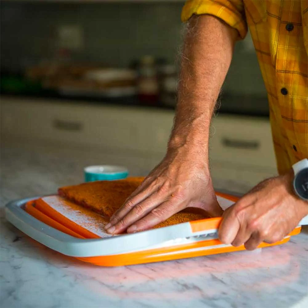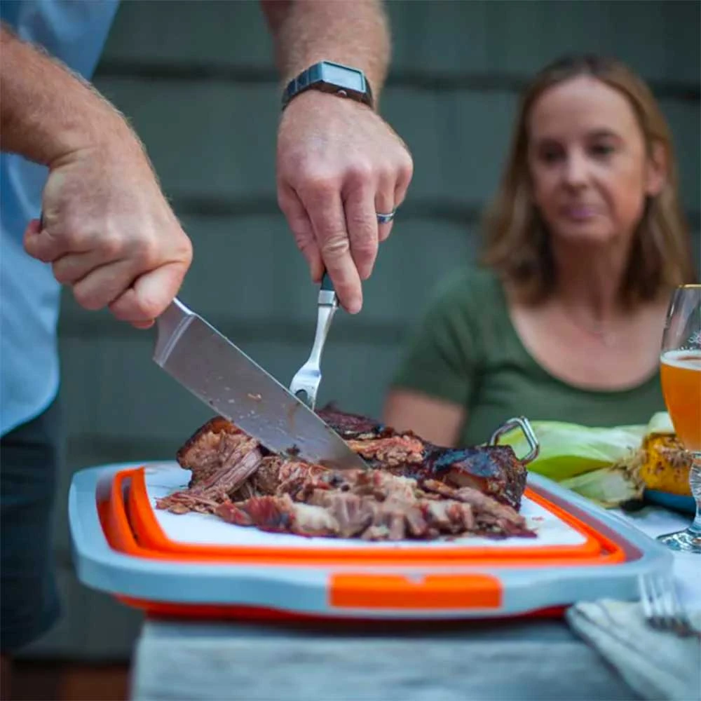 For mess-free prep for your next BBQ, the Drip EZ XL Prep Tub has you covered! This orange tub is perfect for applying dry rubs or marinades without spilling. It also collapses so you can use the built-in cutting board after your food comes off the grill. After prep is done, clean it out and fill it with ice to keep your beverages cold. The collapsible design makes the Drip EZ tub compact for space-saving storage. A lid is included for using the tub for temporary food storage.