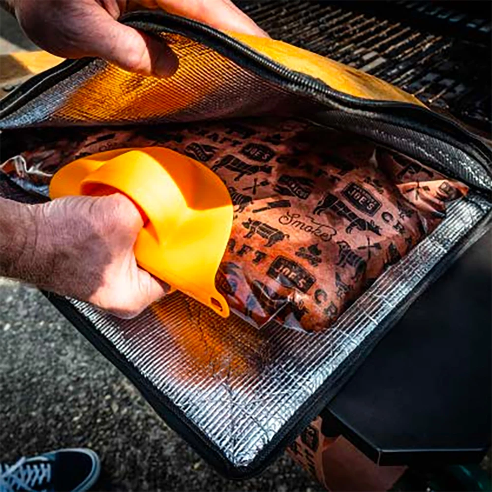The Drip EZ Rest EZ BBQ Blanket allows for controlled heat loss and excellent moisture retention. Resting helps your BBQ reabsorb moisture for the most tender, juicy BBQ. The Drip EZ BBQ Blanket is insulated for controlled heat loss and moisture retention. Durable exterior with a heat-reflective interior. Heavy-duty zipper and Wide Mouth design to allow for large briskets. Easy to wash with soap and warm water. Easy to dry and store. Dimensions: 21 1?4″ L x 16″ W x 8″ H. To clean, hand wash with soap and warm water.