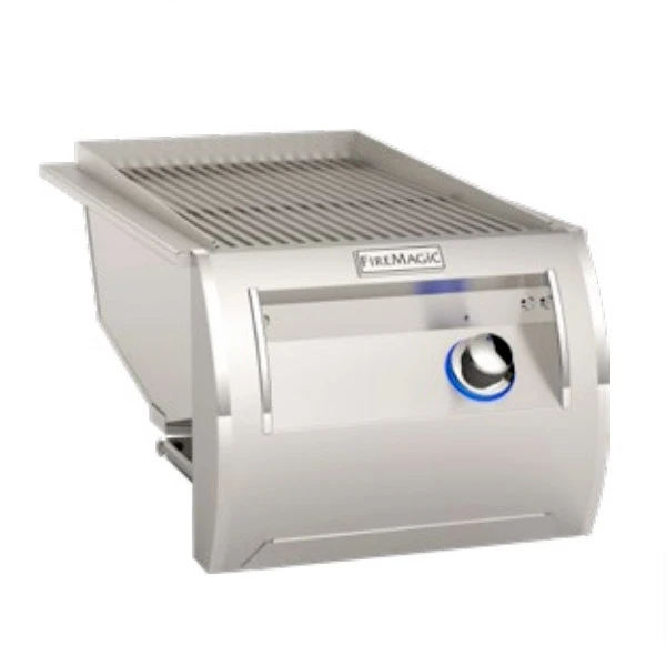 This Fire Magic Echelon Diamond searing station is designed as a companion cooker to your Fire Magic Echelon Diamond grill and features a matching stainless steel face, as well as back-lit knob, hot-surface ignition, patented Diamond Sear cooking grids, and a power switch. Sear favorites such as ahi tuna and marbled fillet mignon to perfection with 24,400 BTUs and up to 1000 degrees Fahrenheit of infrared heat, locking in juices for tender meat and full flavor. Perfect for an amazing seared steak. This searing station plugs in to the Echelon Diamond grill transformer for power, otherwise it requires an additional transformer if used independently of the grill (part number: 24187-18). Includes stainless steel lid to protect your searing station while not in use.