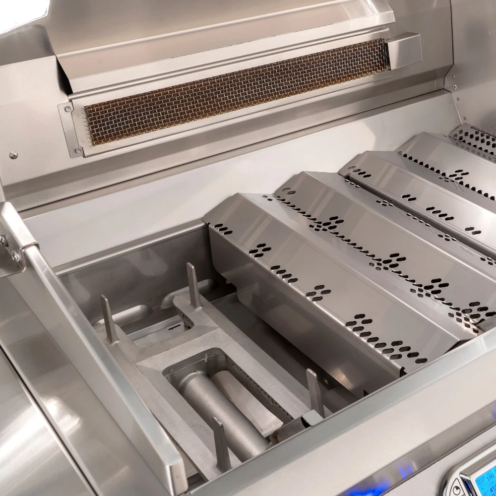 When only the best will do, the top of the line Fire Magic Echelon grill combines the ultimate in performance, beauty and innovation. With sleek lines, a unique contoured face and state of the art features such as hot surface ignition, blue back lit knobs, and Quantum backburner. Echelon Diamond defines luxury in grilling. Featuring 660 square inches of cooking space, this 30-inch gas grill has patented Diamond Sear cooking grids with 304 stainless steel bars that have a smooth flat top, shaped to optimally transfer the heat from the burners to the cooking surface so food cooks faster and more evenly! The Flavor Grids are made of 16-gauge 304 stainless steel and allow heat to rise unobstructed from the burner to cooking grids. They disperse heat quickly and evenly flavor the food by vaporizing juices and minimizing flare ups. Achieve a steakhouse style sear with the included infrared sear burner and two(2) thick cast 304 stainless steel burners boasting 75,000 BTUs of cooking power. The recessed infrared quantum backburner uses 100-percent stainless steel foam, providing 11,000 BTUs of heat for quicker, more efficient rotisserie grilling with the included rotisserie kit. Enhance the flavor of the food you grill with the included stainless steel charcoal smoker basket that sits on top of the burner easily igniting the charcoal or wood chips. Lighting your grill is easy with the comfort touch back-lit polished knobs and included hot surface ignition for a reliable start. Control your grill with the state-of-the-art electronic thermometer display, which allows you to operate all cooking zones at one temperature, or control each zone independently to grill a variety of foods at once. The digital display also allows you to check the status of the included meat probe or turn on the interior halogen lights.