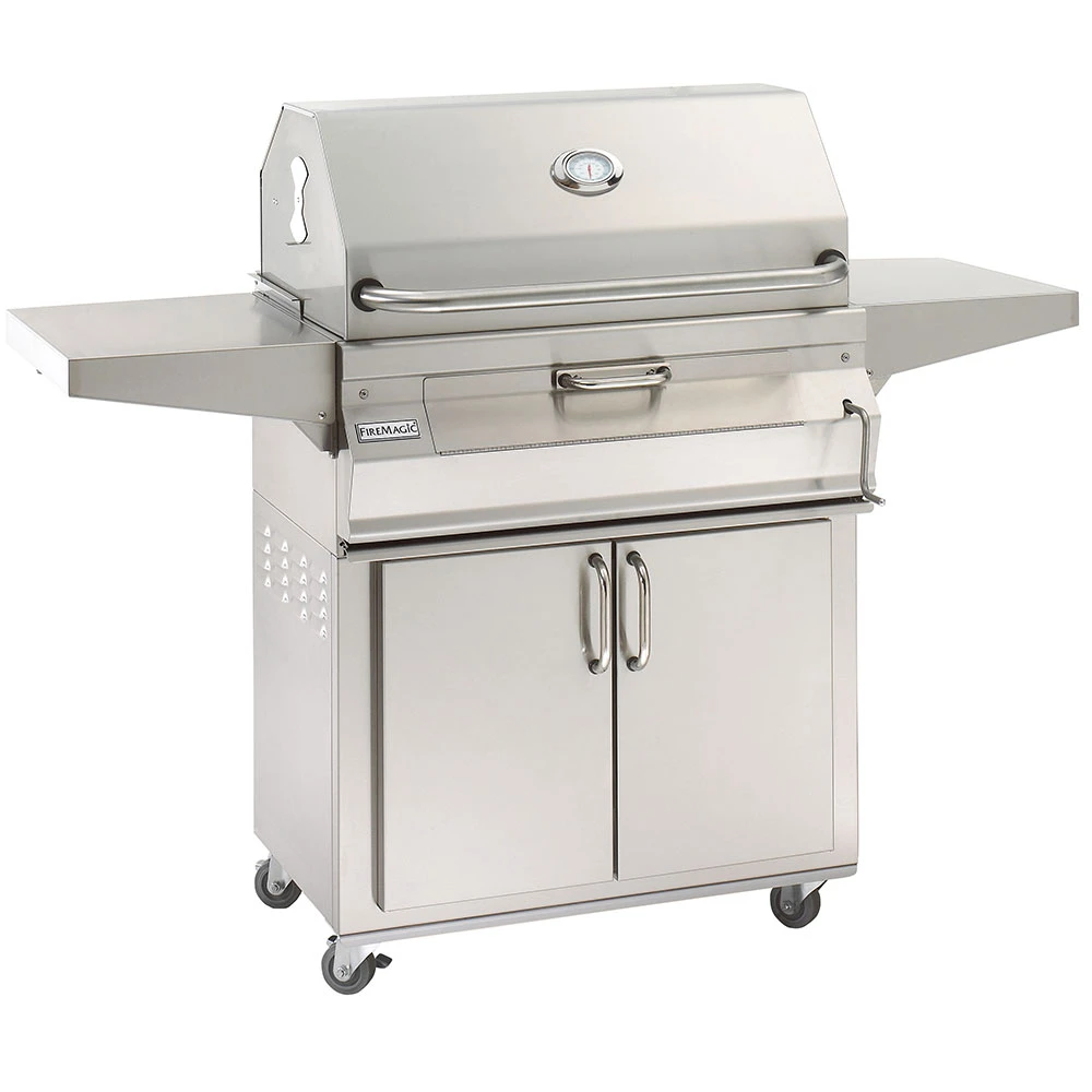 The Fire Magic Legacy 24-Inch Smoker Charcoal Grill 22-SC01C-61 incorporates all of the power and flavor of a natural wood fire, with the luxury add on features like Diamond Sear Cooking Grates. The Fire Magic 22-SC01C-61 features a 432 square inch cooking surface (24″ x 18″) of flat-top style Diamond Cooking grates that allow each grate bar to be shaped to optimally transfer the heat from the charcoal heat to the cooking surface so food cooks faster and more evenly. American-Made 304-grade stainless steel construction, a high-height heavy-duty stainless smoker hood with a precise analog thermometer and adjustable air shutters. The 22-SC01C-61 charcoal smoker hood features adjustable air shutters for easy temperature control and optimal air intake creating the perfect airflow. The ease-of-use adjustable charcoal pan and easy-access charcoal drawer make adding charcoal and smoker chips a breeze. The Fire Magic 22-SC01C-61 smoker also includes a charcoal shield for use with indirect cooking and a full-width warming rack that stays flat even and moves over the coals when the oven is closed, creating a secondary cooking surface. Stainless steel cart includes two(2) large stainless steel side shelves, 304-grade stainless steel construction, and double access doors for ample storage underneath your charcoal grill.