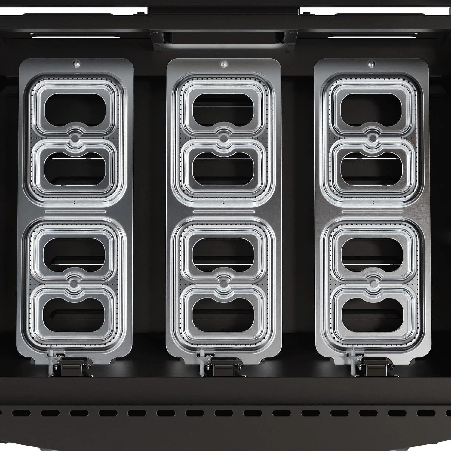 Transform your outdoor cooking experience with the Elite3B Griddle. With 564 square inches of cooking surface, this griddle is the perfect choice for on-the-go, hosting tailgate parties, camping or entertaining guests at backyard gatherings. Boasting 3 burners with 6 temperature zones, you can precisely control the heat distribution across the entire cooking surface. Ignite just the front zones, or light up all zones for wall-to-wall heat. The inset griddle plate design ensures that your flame stays lit even in windy conditions, and the built-in bubble level and adjustable 360 degree wheeling casters allow you to easily move the griddle to any location and keep it level. The innovative burner site glasses of the HALO allow you to monitor the flame from the front of the griddle, for quick and easy ignition check. With a quick warm-up time of just 10 minutes, you can reach temperatures between 300 degreeF to 750 degreeF in no time and start cooking up a variety of delicious meals, from breakfast dishes to stir-fry, burgers, steaks, and skewers. The swing-away warming rack provides extra space when you need it and can be tucked away when not in use. When you?re finished cooking, cleaning is a breeze thanks to the XL rear grease management system and built-in utensil clean-off squeegee. So, upgrade your griddle game with the Elite3B and start cooking like a pro!