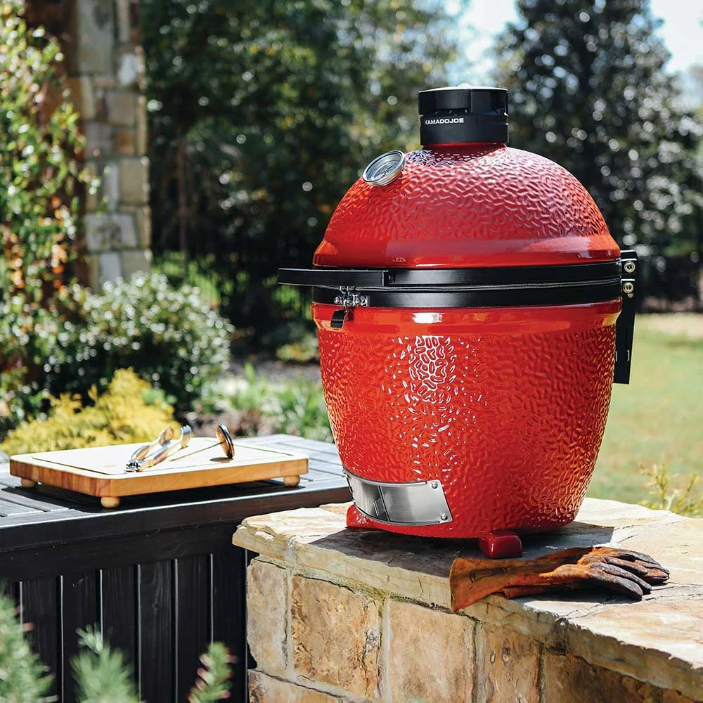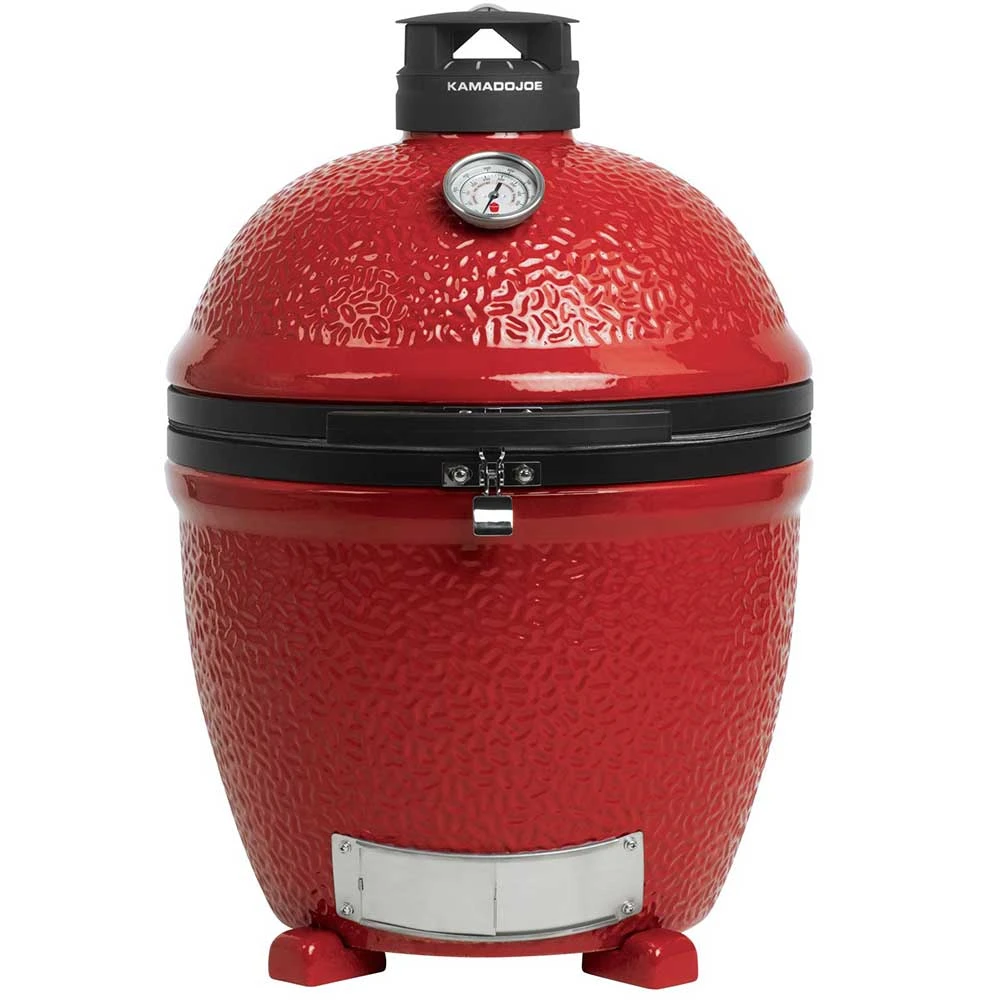 The Kamado Joe KJ23NRHC Classic Joe II 18-Inch Stand-Alone Ceramic Grill features a thick-walled, heat-resistant shell that locks in smoke and moisture at any temperature. The easy-open dome includes our counterbalanced Air Lift Hinge and element-proof, ultra-precise Kontrol Tower top vent, while the large cooking surface underneath is crafted from commercial-grade 304 stainless steel. Other featured innovations that come standard with the Kamado Joe Classic II include the Divide and Conquer Flexible Cooking System, Advanced Multi-Panel FireBox, a heavy-duty rolling cast iron cart, and a patented slide-out ash drawer for easy cleaning. The Kamado Joe KJ23NRHC kamado grill is constructed from 1 1/4-inch thick ceramic that holds heat, maintain any temperature and is extremely porous to keep moisture in your meat, producing incredibly juicy, tender food with a true wood-fired flavor. Cook for the whole family on the 304-grade stainless steel cooking grate that measures in at 254 square inches. Cook on two different levels at once using the Divide and Conquer Flexible Cooking System or use the two split heat deflectors for indirect cooking and baking for truly versatile cooking. The patented Kontrol Tower top vent maintains a consistent air setting for precise temperature management, and it will not slip out of position as the lid is opened. The top vent is constructed with cast aluminum for superior resistance to rust. The dome lid and base feature a double thick, wire mesh fiberglass gasket which offers a superior air-tight seal and long-lasting performance. The stainless steel lid latch self activates when you close the lid, ensuring heat does not leak through the seal. The fire grate is made of powder-coated cast iron for durability and superior heating performance, while the patented slide-out ash drawer makes cleanup easy. The airlift hinge reduces the dome weight by 96%, making it easy to lift the heavy ceramic lid with the high-density polyethylene (HDPE) handle. The lid will also stay open at any desired position, allowing you to cook with the lid partially open if you choose to. The KJ23NRHC Classic Joe II Kamado grill comes with a free grill gripper for handling hot cooking grates and an ash tool for safely and easily removing ashes. The Classic Joe also includes a flexible cooking rack and heat deflector.