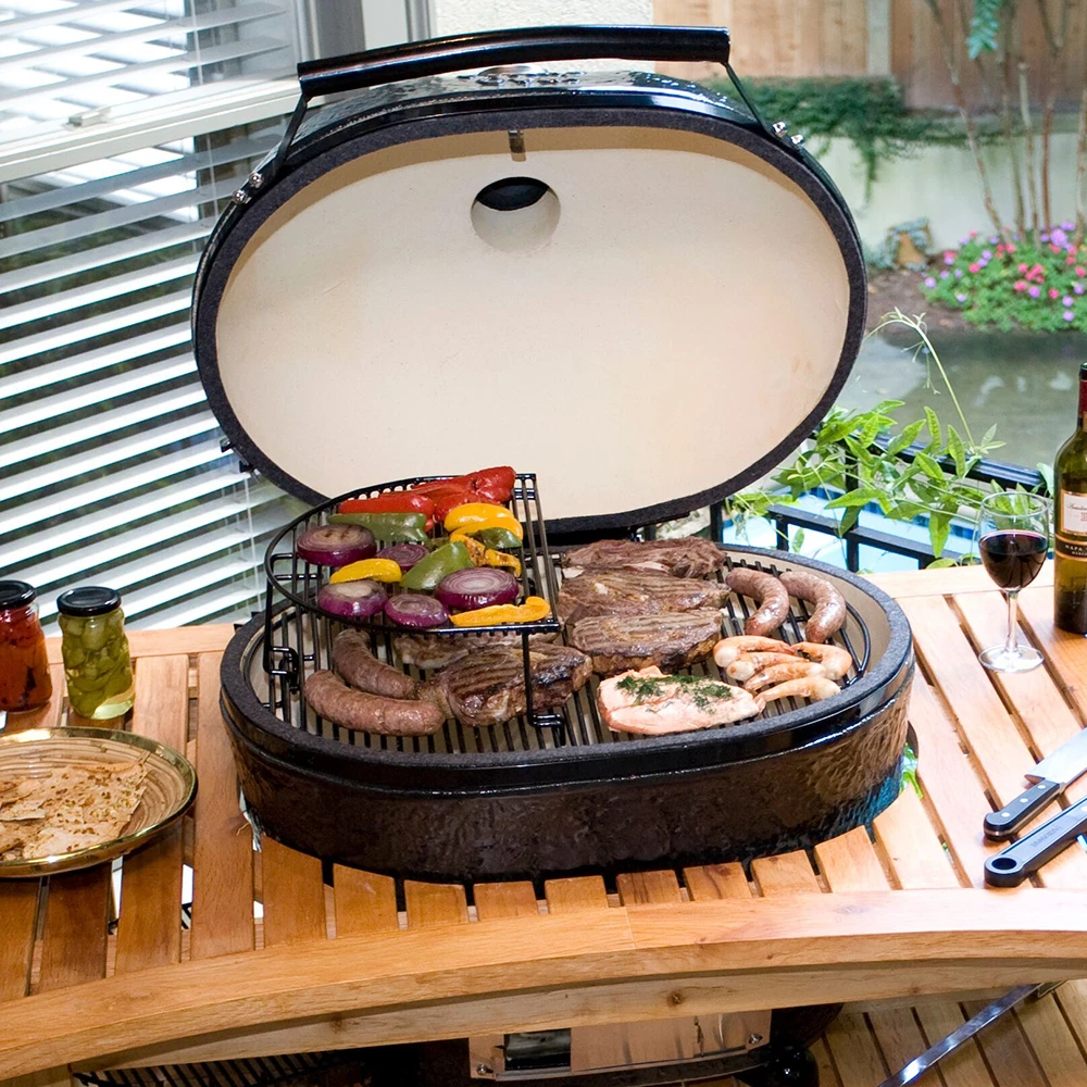 Primo has always been at the pinnacle of innovation and diligently trying to make your Primo Grill, better. This extension rack (332) from Primo features solid porcelain-coated steel construction and fits on your Primo Oval XL, perfectly. Increase your cooking surface by 30% or double it to 60% by ordering two units. Simply place on top of your existing Primo cooking grate and create a unique way to cook different types of food on your Primo Oval XL. With this Primo multi-tiered cooking system you can cut the time of cooking for large groups in half or make a variety of foods all at the same time. Set up a searing zone on one side, and an indirect coking zone on the other. When it comes to creating the perfect Primo grill, this is one accessory you need to have, the Primo Extension Rack (332) for your Primo Oval XL.