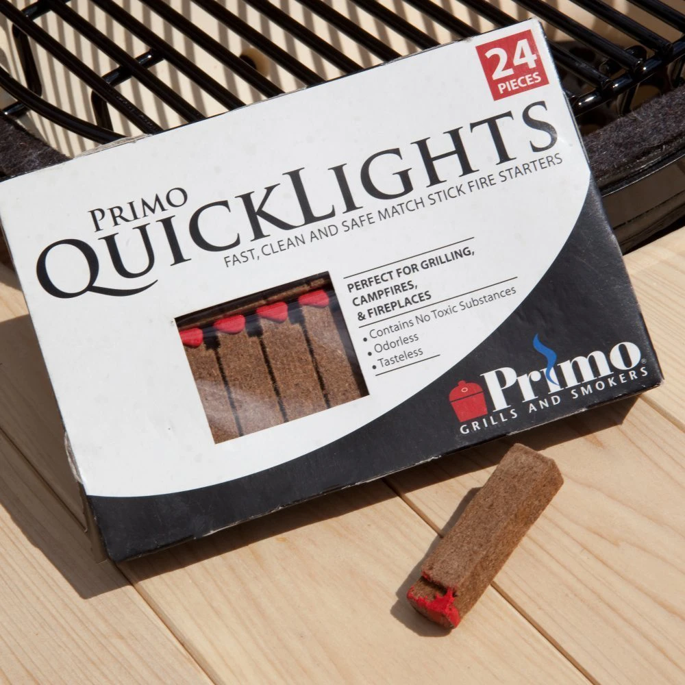 Quickly and easily light your all-natural lump charcoal with the Primo QuickLights (609) match stick fire starters. Light the matchstick tops on the striking strip, conveniently located on the side of the package. Then stick one or two of these fire starters into the charcoal. Close your lid, open both your top and bottom vents and within a few minutes, you will have perfect cooking coals. Each pack contains 24 Quick Lights.