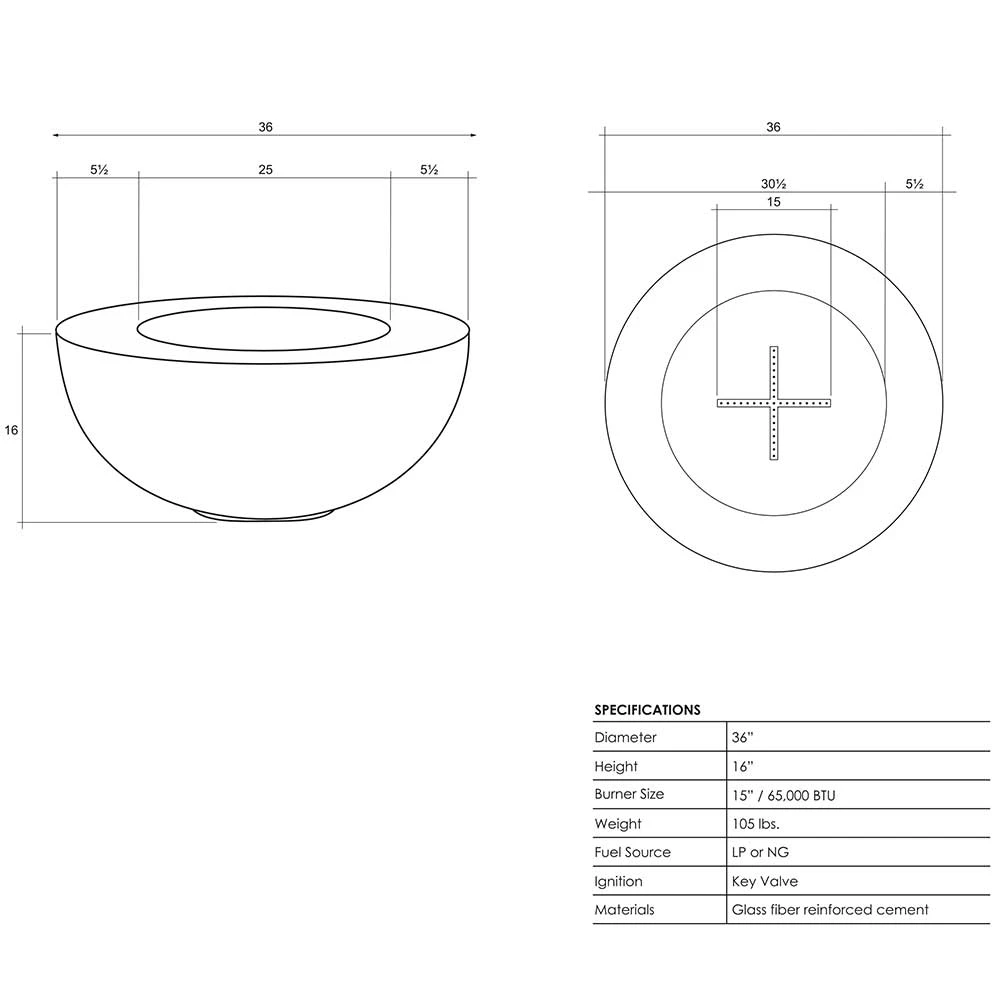 The Moderno 5 Fire Bowl provides an outdoor retreat of warmth and ambiance. Each bowl has been hand-crafted using a custom patina finishing process, guaranteeing a one-of-a-kind creation with subtle variation. The 36″ diameter bowl provides a beautiful and functional centerpiece for any backyard, patio or lounging area. The ambient heat provides plenty of warmth for multiple people. This 65,000 BTU unit operates with a Natural Gas hookup. The key valve housing is easily accessed from the side of the unit. The controls are clearly labeled and simple to use. Turn the key to the on position and use a match lighter to light and enjoy. The fire pit comes complete with two 25lb bags of 3/4-inch lava rock. The naturally occurring volcanic rock creates a stunning contrast to the beautiful flames of any gas fire feature while the lava rock is heat resistant.