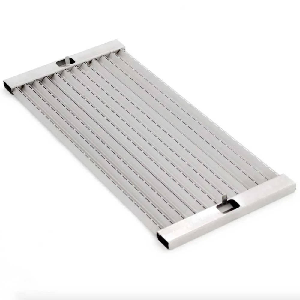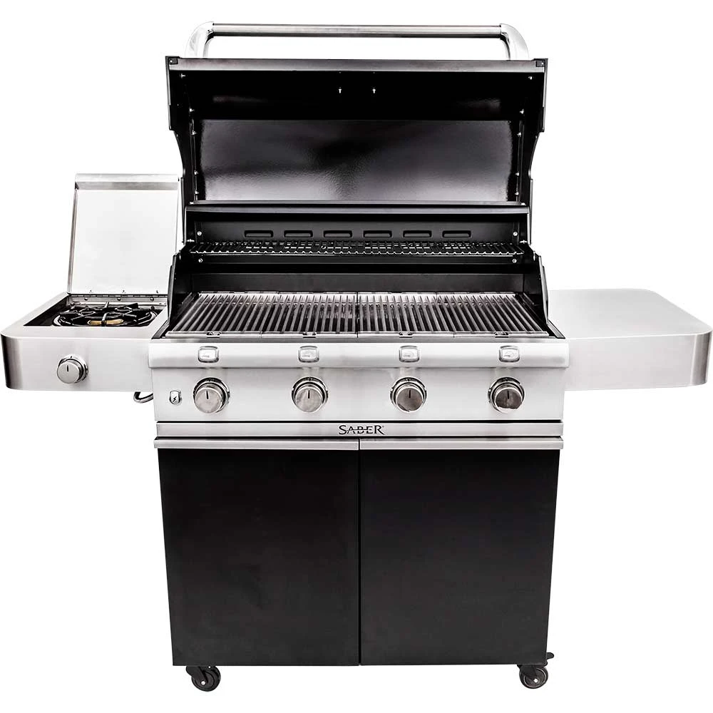 The Saber Grills (R67CC1117) Cast Black 670 4-Burner Infrared Gas Grill combines a black porcelain lid with heavy-duty cast-aluminum end caps and patented cooking technology for luxurious backyard grilling. The patented Saber infrared cooking system allows you to cook up juicier and more flavorful meals than traditional systems that use dry convection air. The unique SABER cooking grates and infrared emitters prevent flare-ups and direct airflow away from the cooking surface, providing evenly distributed, indirect heat for maximum moisture retention while grilling. The cooking grates also catch any drippings and debris, protecting the burners and creating that familiar BBQ sizzle as foods are infused with more juicy flavor. Designed with fuel efficiency in mind, the Saber Grills infrared cooking system delivers quality results faster than most gas grills while consuming 30-percent less fuel. The burners, emitters, and cooking grates are made of 304 commercial grade stainless steel, ensuring long-lasting performance in your outdoor patio. The Saber Grills R67CC1117 Cast Black 670 40-inch propane gas grill features an all-black porcelain lid with heavy-duty cast-aluminum end caps. Four 8,000 BTU gas burners, provide evenly-distributed heat across a 670 square-inch cooking surface. An adjustable, enamel-coated warming rack folds down to keep foods warm and can be folded away for additional space when using a rotisserie kit with the integrated rod holders (rotisserie kit sold separately). Precisely manage grilling temperatures across three cooking zones and ensuring reliable start-up with integrated push-button electronic ignition. Four grate-level temperature gauges with annealed stainless steel bezels allow you to easily monitor grilling temperatures, even while the lid is lifted. Two enamel-coated steel side shelves provide a convenient workspace with die-cast BBQ tool holders and a towel bar, as well as a 10,000 BTU side-burner in the left shelf for preparing sides and sauces while you grill. Cleaning your Saber grill after meals is easy thanks to the porcelain-coated burner boxes, firebox liners, and front-access grease tray, simply burn off and brush away any remaining debris with the included grate scraper. The Saber EZ assembly cart features fully-enclosed, powder-coated storage space with black powder-coated access doors and has heavy-duty, nylon locking casters for easy placement.