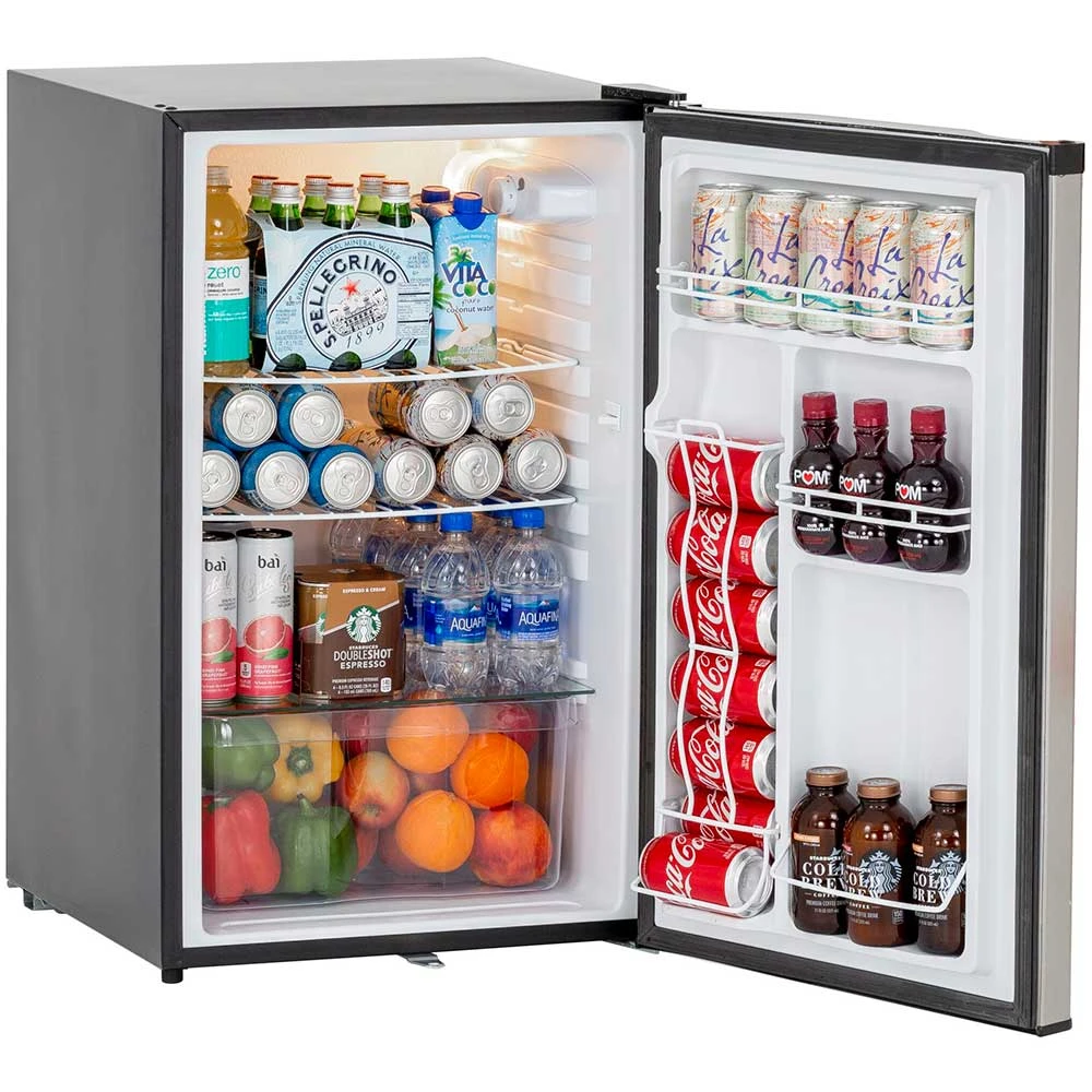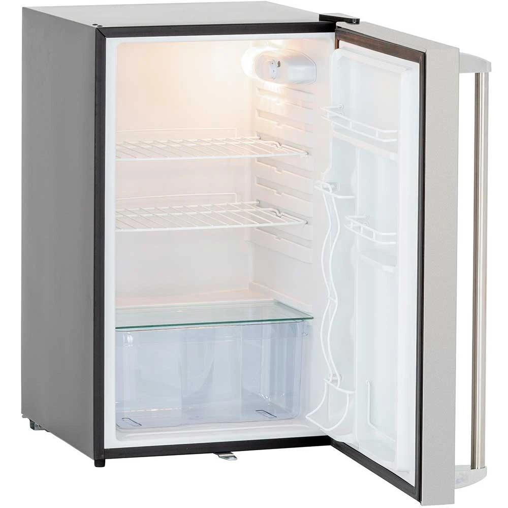 The Summerset Grills 21-inch 4.5 cubic foot right-hinge compact refrigerator (SSRFR-21D) is the ideal space-saving solution for outdoor kitchens, game rooms, apartments or anywhere else. This UL and ETL listed compact refrigerator offers a spacious 4.5 cubic feet of convenient cold storage that features rich design and energy efficiency. The interior design offers plenty of shelf space for all your favorite refreshments and foods. Three storage shelves include two full and one glass half-shelf. They can be adjusted or removed completely providing lots of arrangement options, there is even a see-thru crisper for fresh fruits and vegetables. The door storage of the Summerset Grills SSRFR-21D features condiment shelves, convenient can dispenser rack and a large bottle area in the bottom shelf. Automatic defrost reduces maintenance and thermostat control lets you bring the temperature down to an amazing 35 degrees Fahrenheit for the coldest drinks and freshest food right at your fingertips. Thoughtful design makes things easy to access and interior light makes things easy to find no matter what time of day or night. Integrated full-length towel bar handle and smooth back design make this freestanding unit easy to integrate into any space while a stylish black cabinet and stainless steel door look great in any decor. The Summerset Grills SSRFR-21D compact refrigerator with a stainless steel door is UL and ETL Listed for quality and safety.