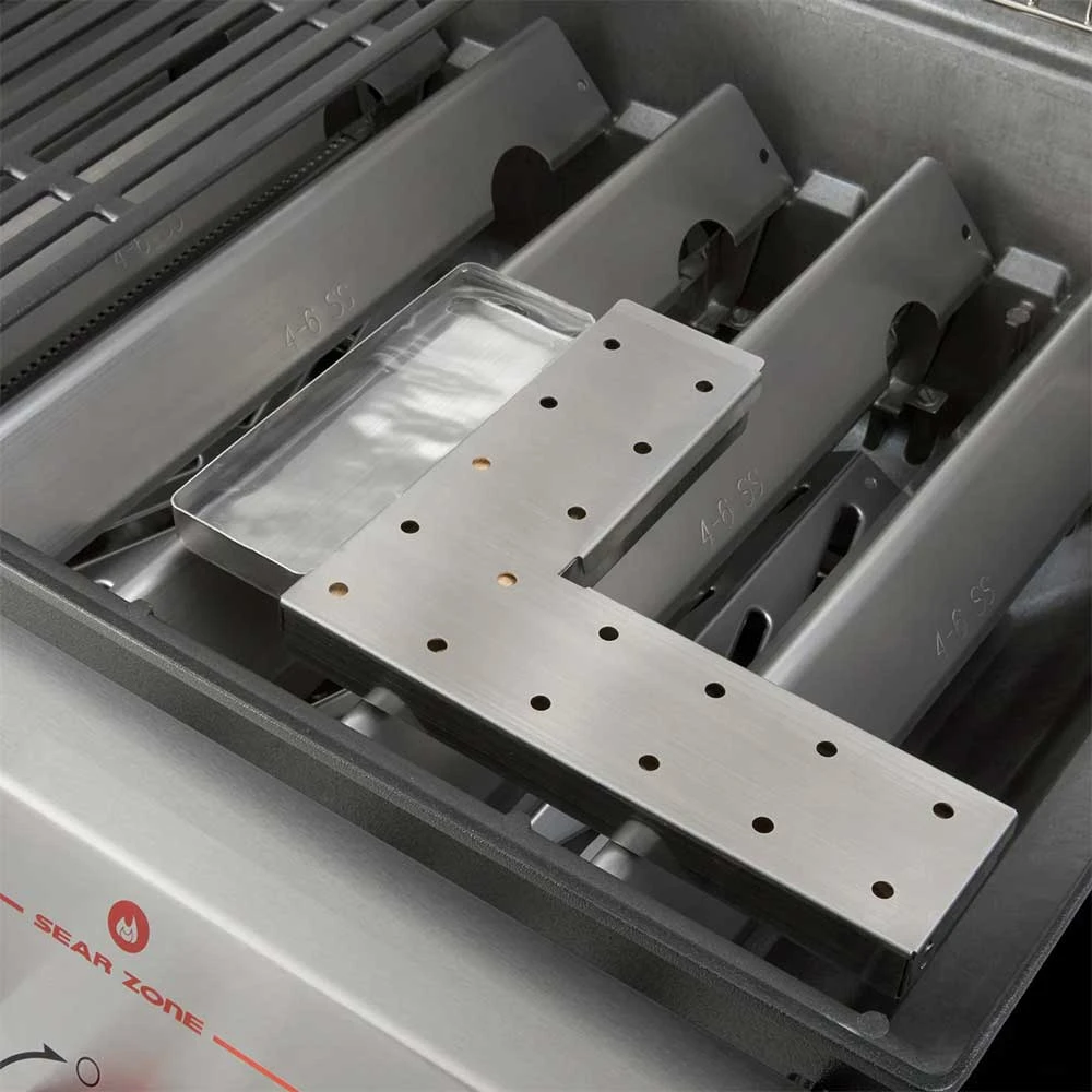 And why should the rest of the grill be any different? The extra-large prep & serve table (conveniently located close to the sear zone, might we add) measures 18 inches across, wide enough to fit multiple serving trays or cutting boards so you can stay where the party is. As for cleanup, Weber listened to heaps of customer feedback in creating a major update for its grease management system: Genesis now comes with a scraper for pushing drippings on the grease tray into the attached drip pan, a simple solution that saves you valuable leisure time. To top it all off, the Weber Genesis SI-E-330 Special Edition natural gas grill has a built-in smoker box so you can bathe food in delicious smoke as you grill.
