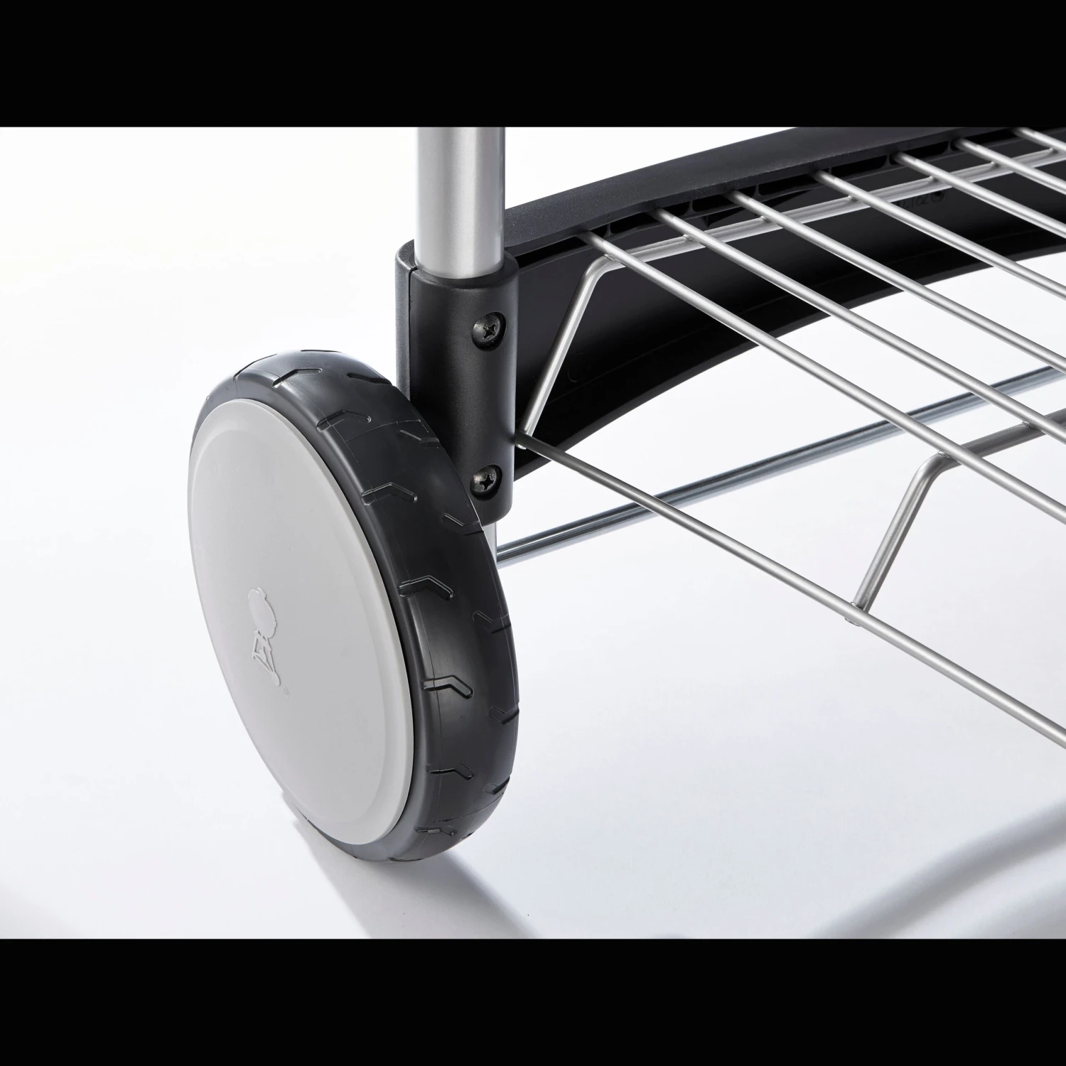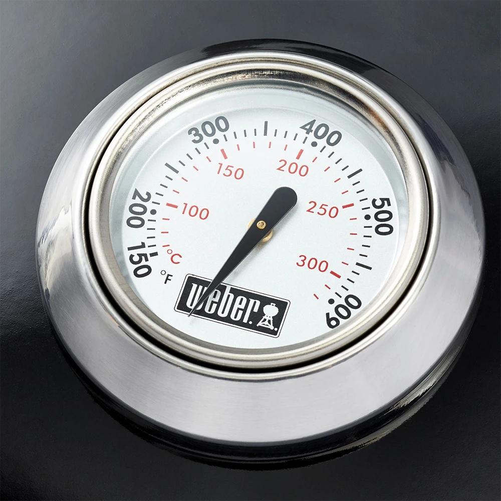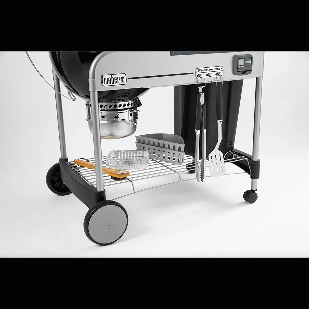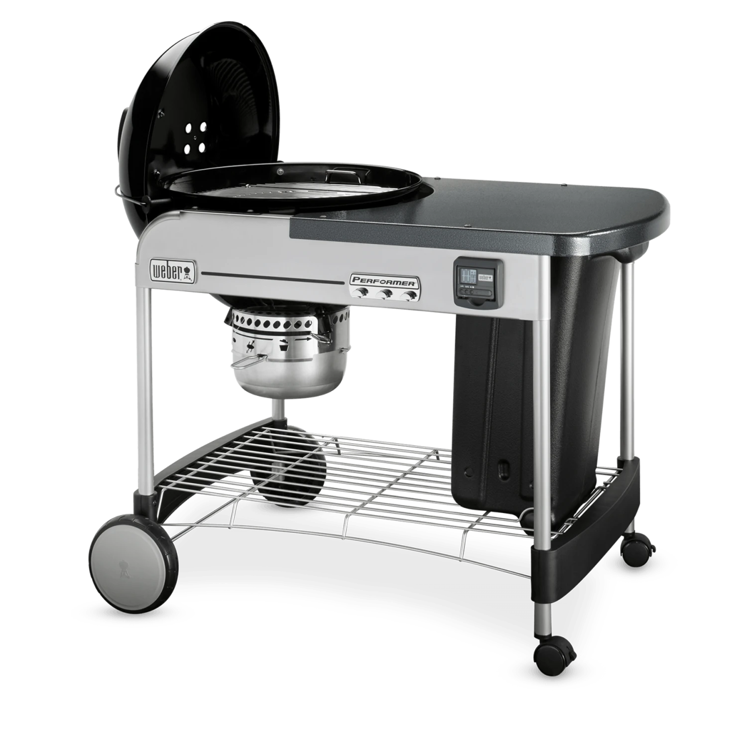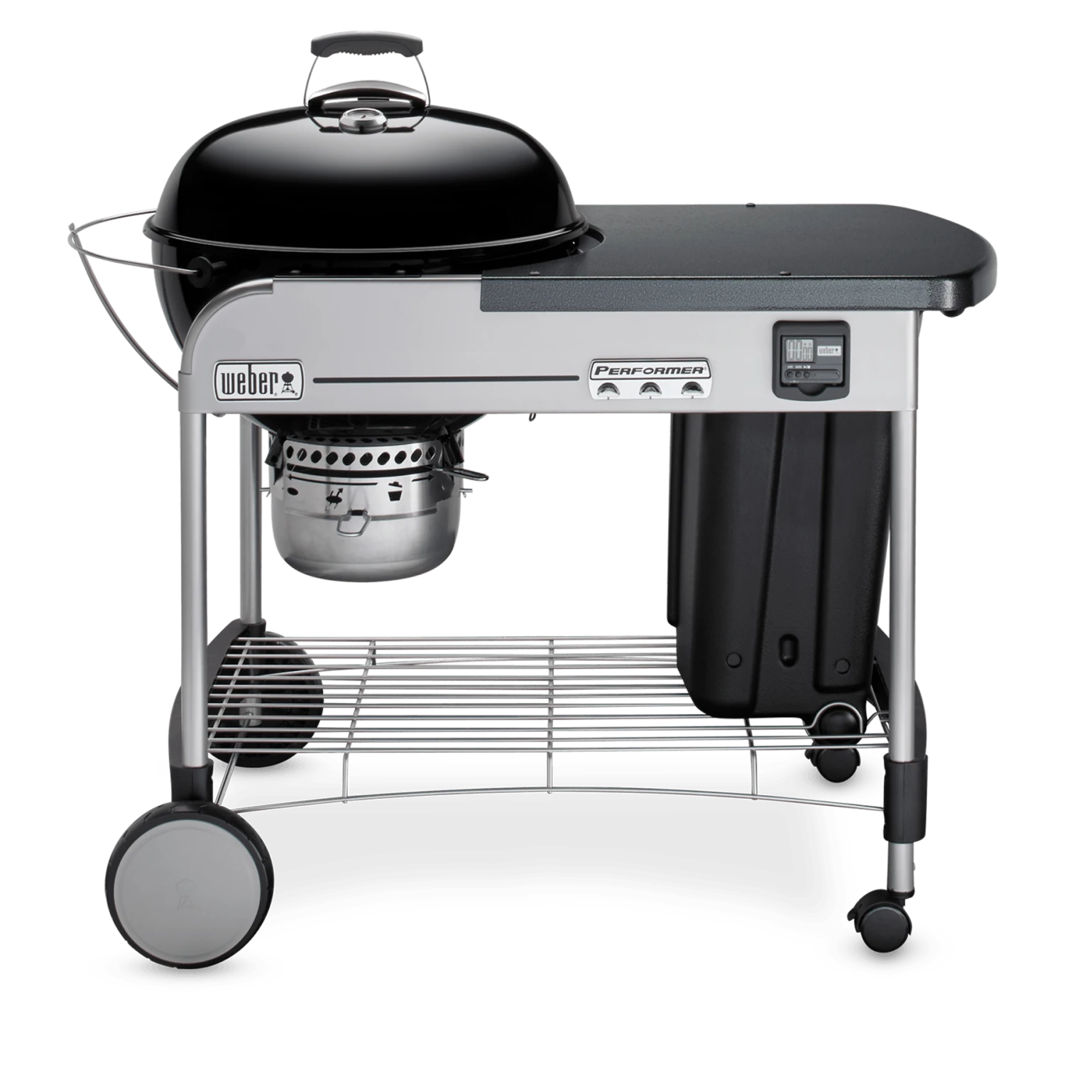Weber combines the best of their iconic charcoal grills with innovative, convenient features in the Performer Grill Series. Made of premium-grade U. S. Steel coated with black porcelain enamel inside and out, the bowl and lid of the Weber 22 inch charcoal kettle grill are precisely formed to allow heat to circulate evenly inside the grill and across the 363 square inches of cooking area. Porcelain enamel coating will not rust or peel, giving your grill years of top performance. The aluminized steel One-Touch cleaning system makes clean-up hassle free. As you rotate the handle, three blades in the bowl move ash through the vents and down into the removable, high-capacity aluminum ash catcher below, which is enclosed to prevent ashes from blowing away and creating a mess. The Touch-N-Go gas ignition system makes charcoal grilling a breeze by lighting the briquettes at the touch of a button using a disposable 14. 1 or 16. 4 ounce propane cylinder (not included). The adjustable, no-rust aluminum top vent provides the proper airflow needed for perfect grilling and, along with the built-in thermometer, allows you to control the temperature inside the grill. Weber Performer grills also feature hinged plated steel cooking grates, for easily adding more charcoal while grilling, a glass-reinforced nylon handle that will withstand the elements for the life of the grill, and a Tuck-Away lid holder that conveniently allows you to store the lid while you grill. The heavy-duty steel cart frame ensures the grill is sturdy and stable, while two crackproof all-weather wheels and two locking casters make moving the grill easy. The cart also has a thermoset work table that adds workspace, three tool hooks, a charcoal storage bin and a wire bottom shelf for storing grilling tools. Includes 2 Char-Basket fuel holders and a Weber cookbook. The Weber Performer Deluxe charcoal grill is where fun meets functional for your backyard BBQ!