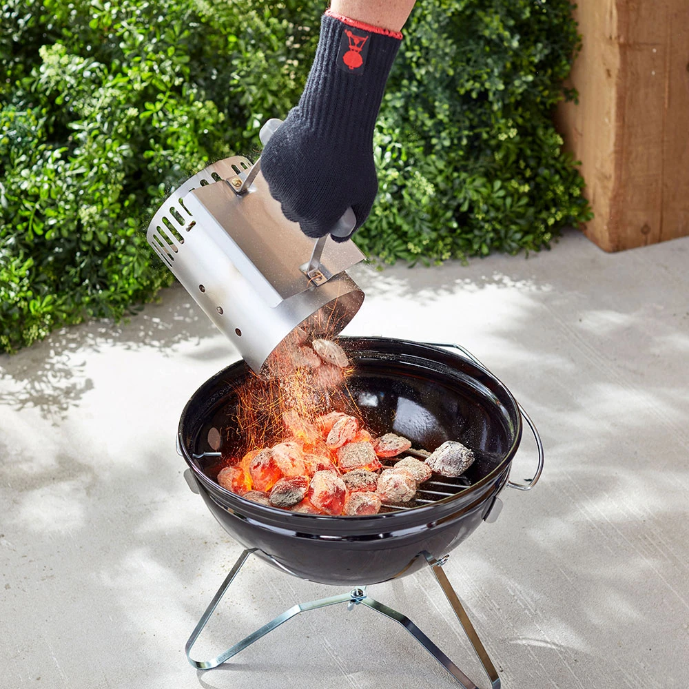 Light your coals quickly and easily with the Weber Grills 7447 Compact RapidFire Chimney Starter. Simply fill the chimney starter with coals on top of lighter cubes or newspapers and light. This chimney starter speeds up charcoal ignition with its unique cone-shaped design that exposes more briquette edges to the flame. For easy handling, the chimney starter has a large, ergonomic handle. This compact chimney starter holds enough briquettes for a Weber Smokey Joe portable grill.